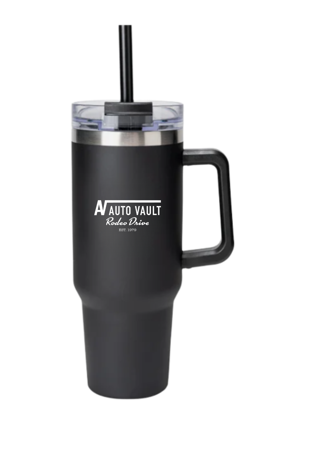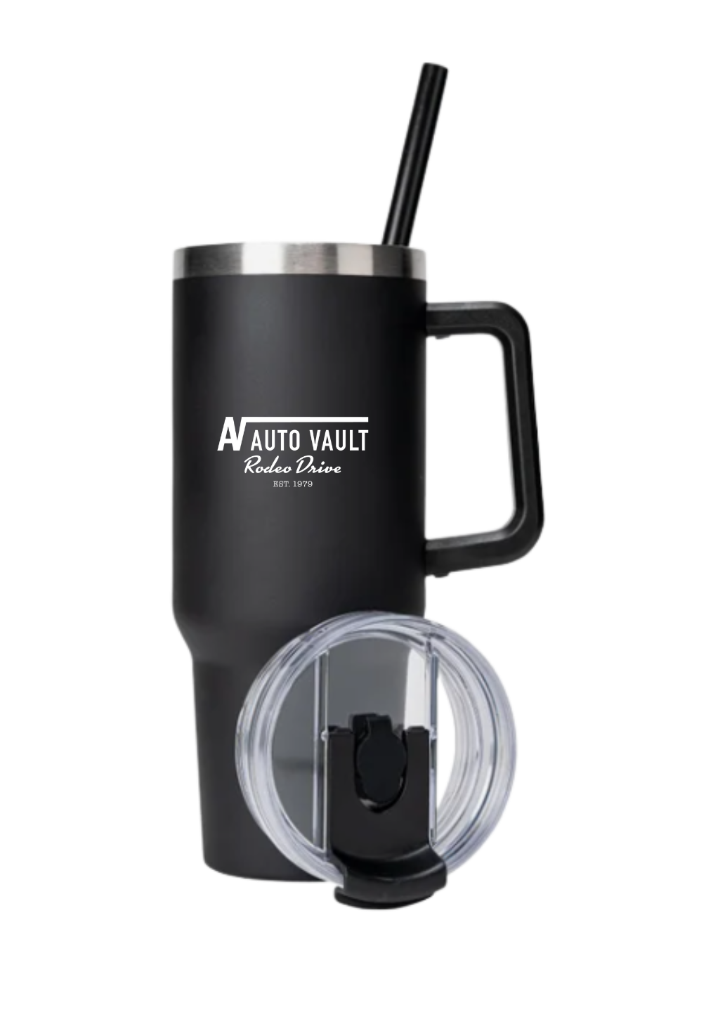 The Auto Vault Stainless Steel 30 oz. Tumbler is perfect for every drink. With vacuum insulation, convenient handle, and optional straw, this travel mug lets you go about your day with ease in style. Keep your morning tea steaming hot and your afternoon matcha ice cold while sporting this eco friendly Classic Auto Vault, Rodeo Drive logo. Fits perfectly in your car cup holder while on the go!